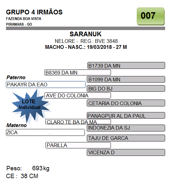 Lote 007 - TOURO NELORE PO - RGN: BVE 3848 - GRUPO 4 IRMÃOS