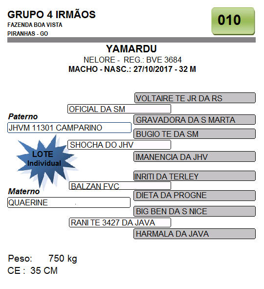 Lote 010 - TOURO NELORE PO - RGN: BVE 3684 - GRUPO 4 IRMÃOS