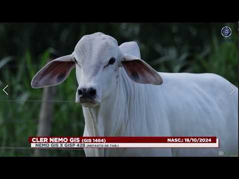 GIS1464= CLER NEMO GIS: Garrote jovem iniciando sua vida reprodutiva, filho do touro NEMO GIS 298 (irmão do NAIM GIS 294), o qual produz bezerros(as) excelentes em nosso rebanho. CLER NEMO nos mostra um grande potencial. Garrote muito comprido, cupim bem implantado, narinas grandes e bem pigmentadas. Apresenta a barbela solta, linha de dorso forte, além de garupa muito plana. CLER NEMO é o touro para agregar muita raça ao seu plantel.